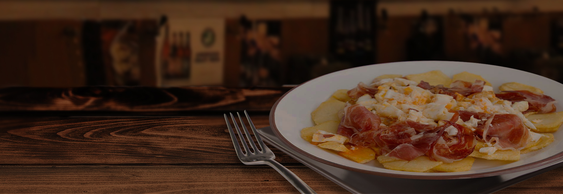 Huevos rotos con patatas fritas y jamón ibérico